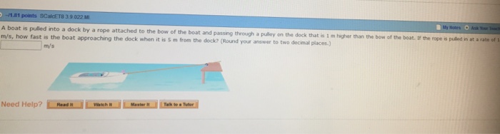 If the rope is pulled through the pulley at a rate of 20 ft min at. If the rope is pulled in at a rate of 1 m s how fast is the boat approaching the dock when it is 5 m from the dock. A boat is pulled into a dock by a rope attached to the bow of the boat and passing through a pulley on the dock that is 1 meter higher than the bow of the boat. If the rope is pulled in at a rate of 1 m s how fast is the boat approaching the dock when it is 7 m from the dock.