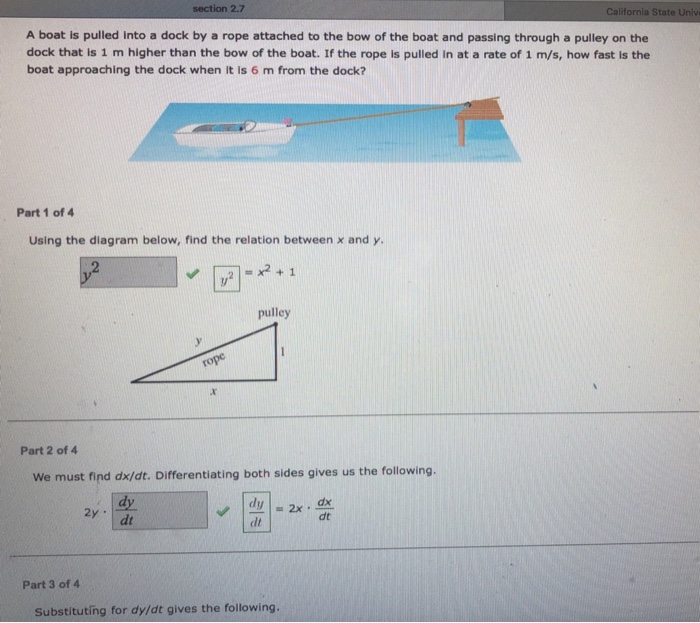 A boat is pulled into a dock by a rope attached to the bow of the boat. Part 1 of 4 using the diagram below find the relation between x and y. A boat is pulled into a dock by means of a rope attached to a pulley on the dock. A boat is pulled into a dock by a rope attached to the bow of the boat and passing through a pulley on the dock that is 1m higher than the bow of the boat. A boat is pulled into a dock by a rope attached to the bow of the boat and passing through a pulley on the dock that is 1 m higher than the bow of the boat.